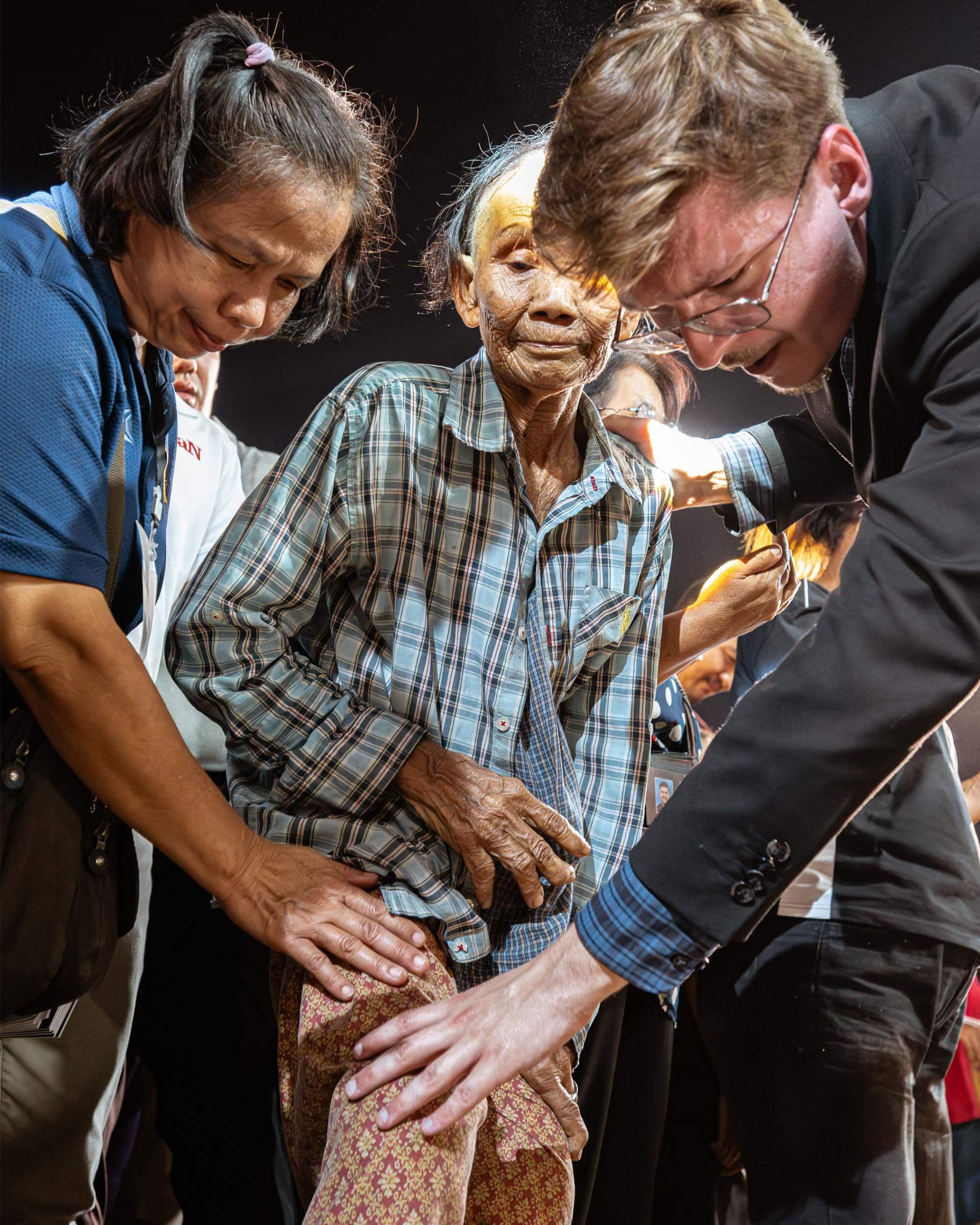 Another testimony we received that night was of a lady named Yay Bunrot. When we asked her what was wrong in her body, she said both of her eyes were blind, with the right eye being completely blind, and the left partially so. But now, she was claiming she could see perfectly! Though she had already exhibited her healing by telling everyone how handsome I was in the microphone (that really happened, ha ha!), I decided to still test it on stage. I stood further away, holding up finger numbers for her to call out. I had her cover the left eye and use only the right eye, formerly completely blind. With each test, she could see the number clearly and called it out to the crowd.